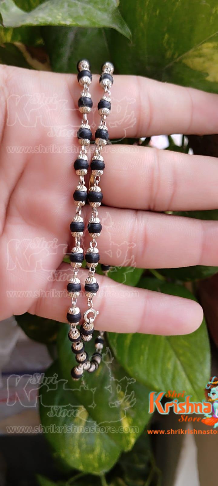 54+1 Silver Shyama Tulsi Capped Black Beads Mala for Men and Women both
