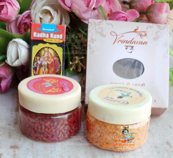 Japa Mala Set-Kanthi Mala,Chandan,Jholi,Tilak Stamp,Radhakund Tilak, And Vrindavan Raj – Pack of 9 Items