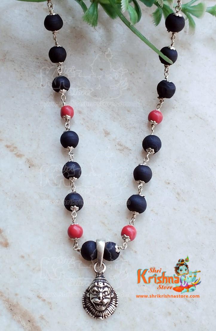 Narasimha God Silver Pendant with Silver Capped Tulsi Beads Garland