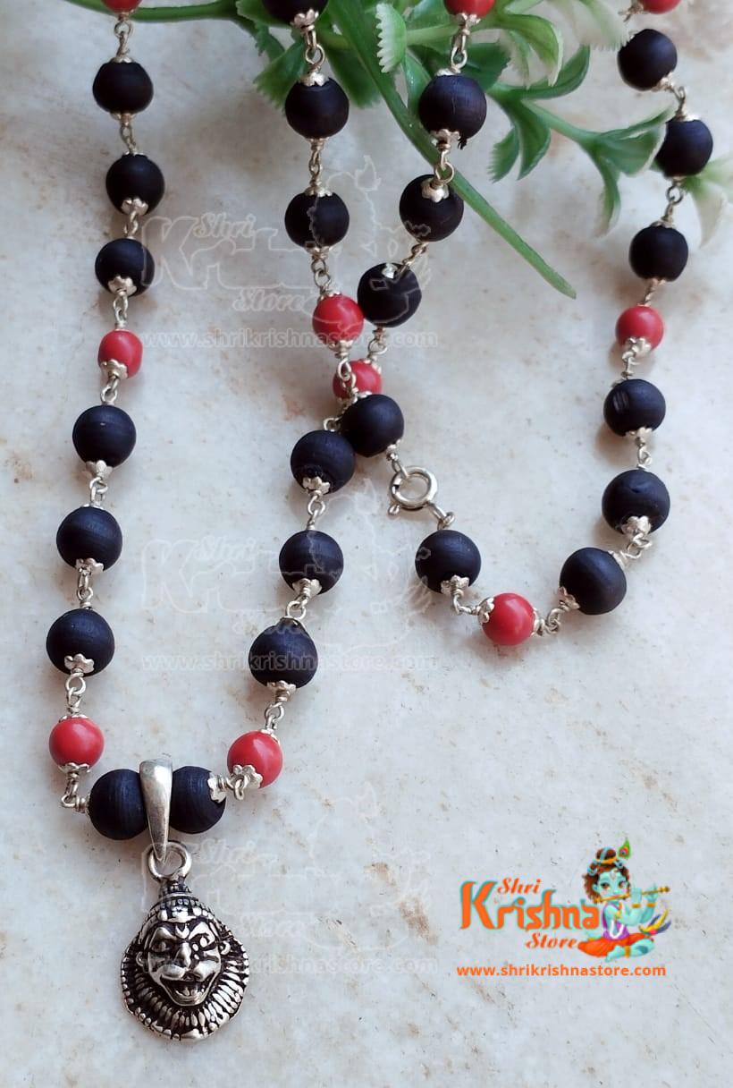 Narasimha God Silver Pendant with Silver Capped Tulsi Beads Garland