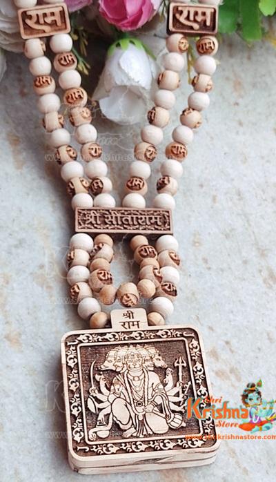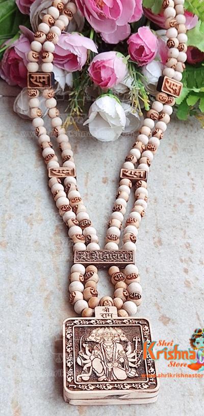 Panchmukhi Hanuman Ji, depicted with Ram and Sita, holds special significance in Hindu mythology. Devotees often engage in worship using sacred items such as Tulsi beads malas. The Panchmukhi Hanuman Ji with Ram Sita Tulsi Tulsi Beads Mala signifies a spiritual connection and devotion. The Tulsi beads mala, made from the sacred Tulsi plant, is revered for its purity and is believed to enhance the spiritual experience. This combination of Panchmukhi Hanuman Ji, along with Ram and Sita, adorned with a Tulsi beads mala, represents a powerful symbol of faith and devotion in Hindu traditions.