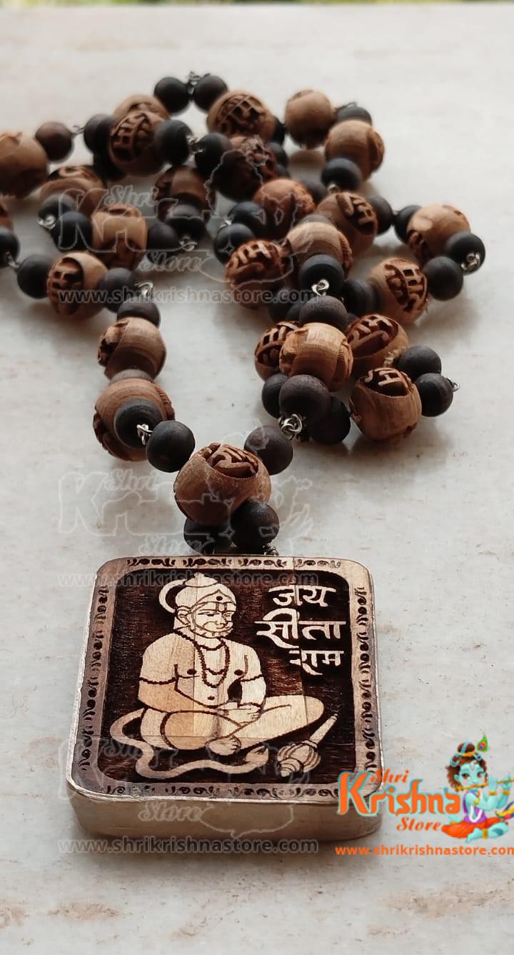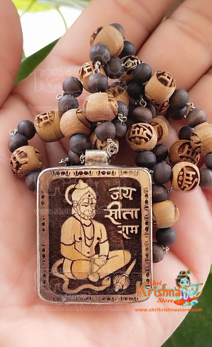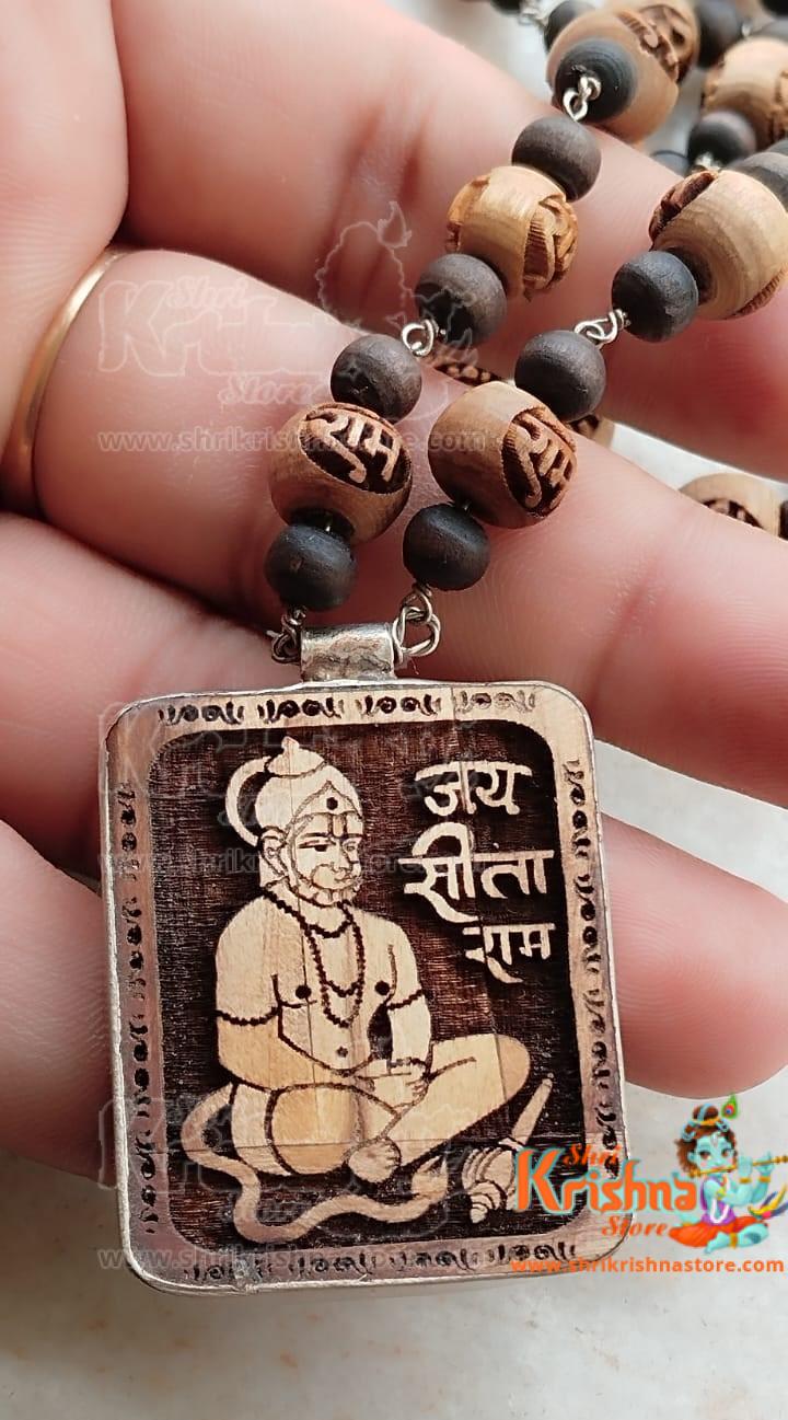 Shri Sitaram Hanuman ji Pendant with Ram Carved Tulsi Beads Silver Mala – 92.5 Purity in Silver