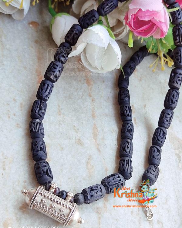 Silver Narasimha Kavach With Black Krishna Carved Handmade Tulsi Mala