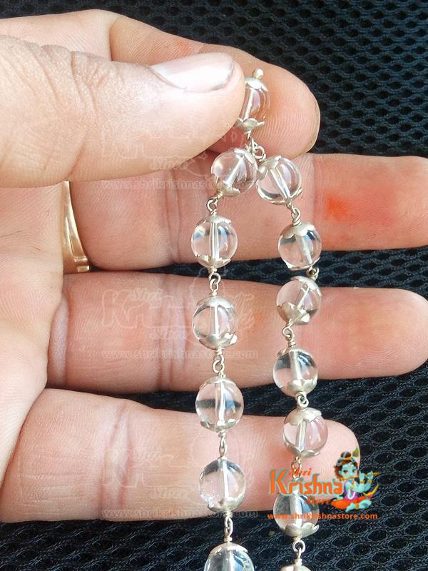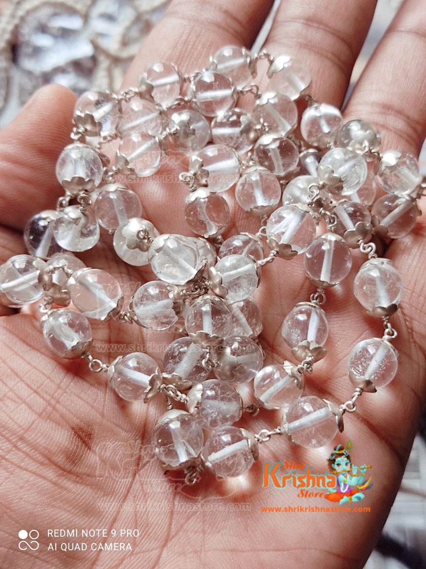 Lab Certified Sphatik Mala in Silver With Big flower Caps – Premium