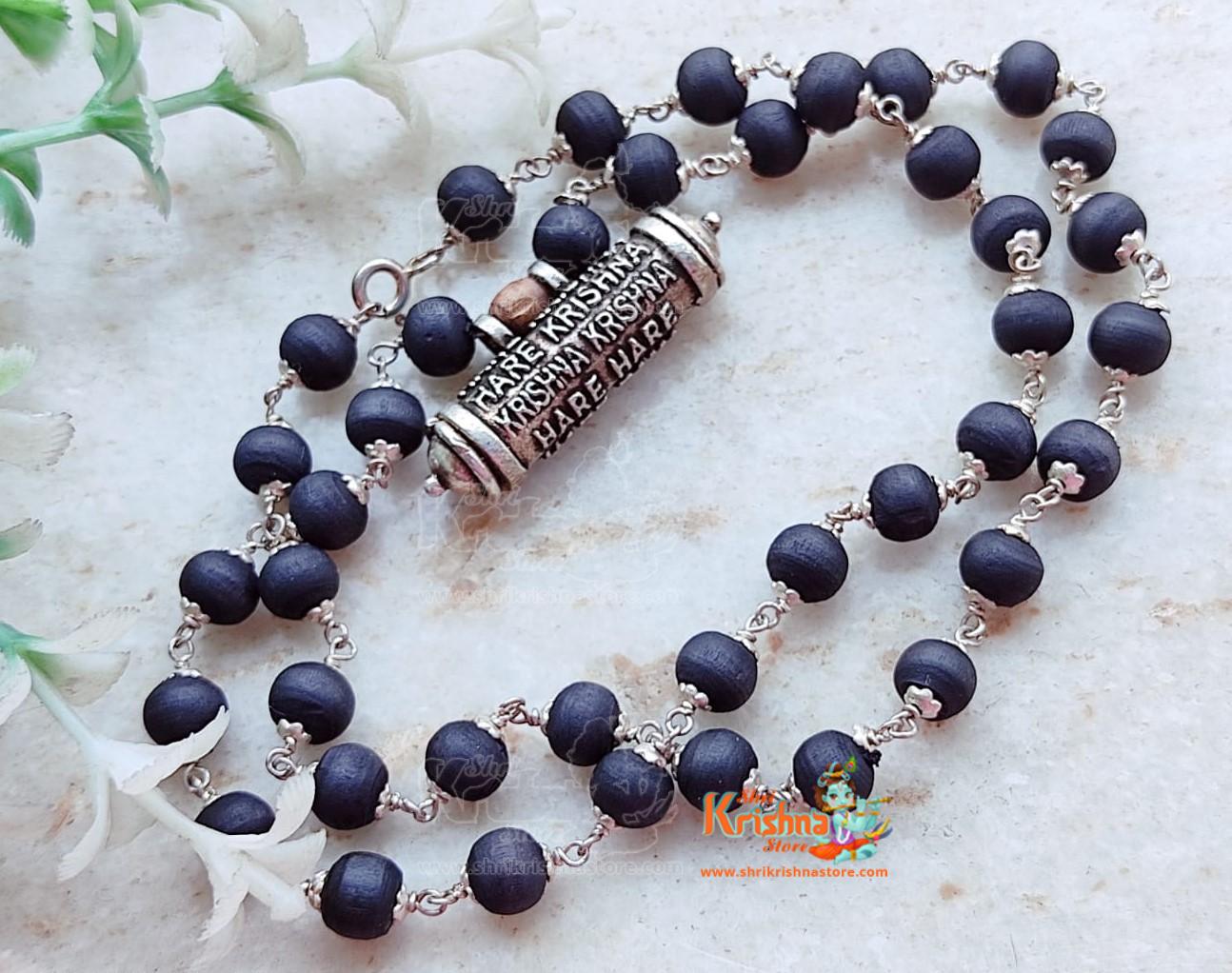 Sterling Silver Hare Krishna Maha Mantra Narshima Kavach, Pendant with Tulsi Shyma Black Mala