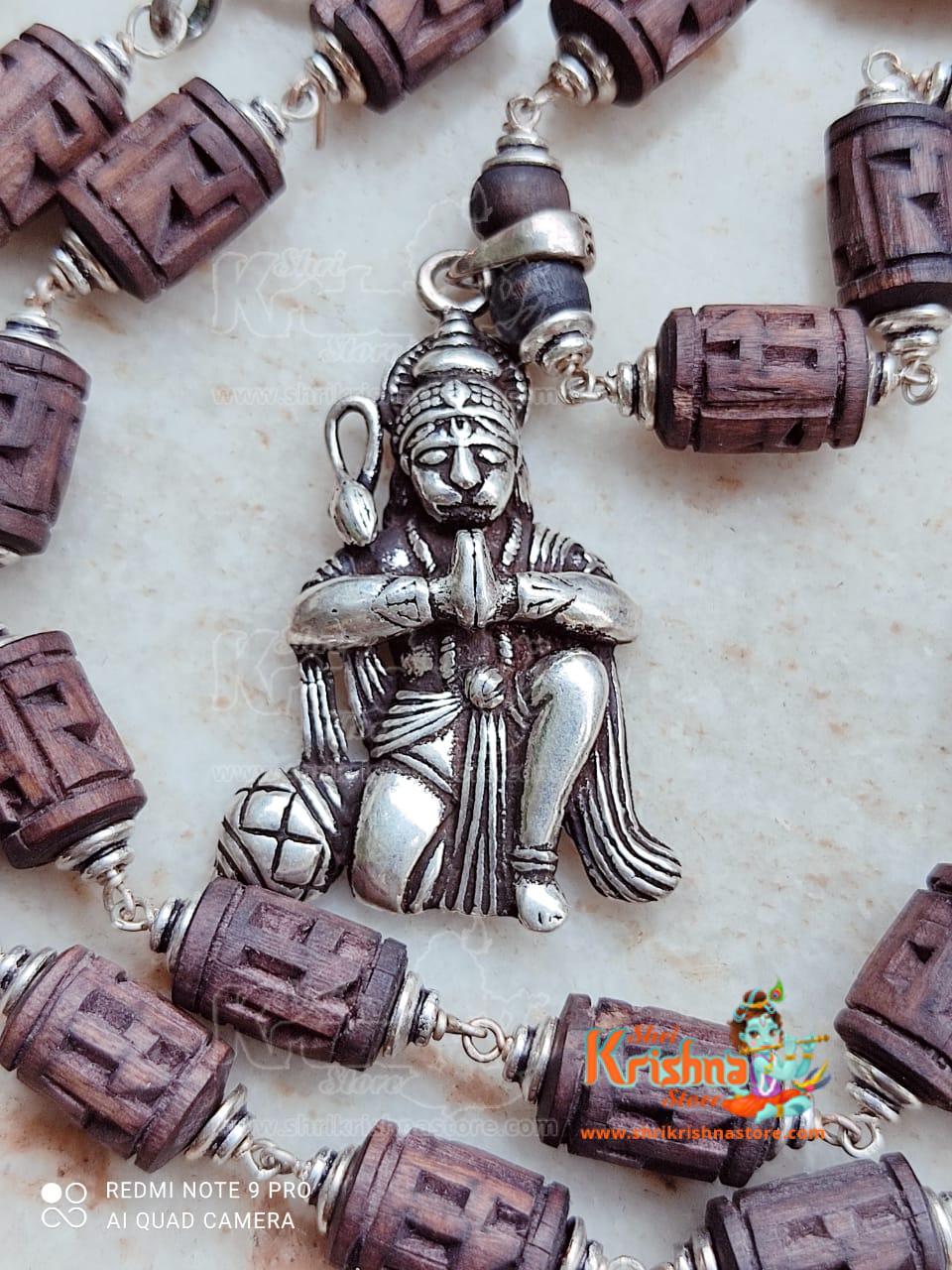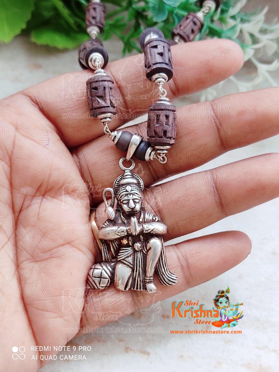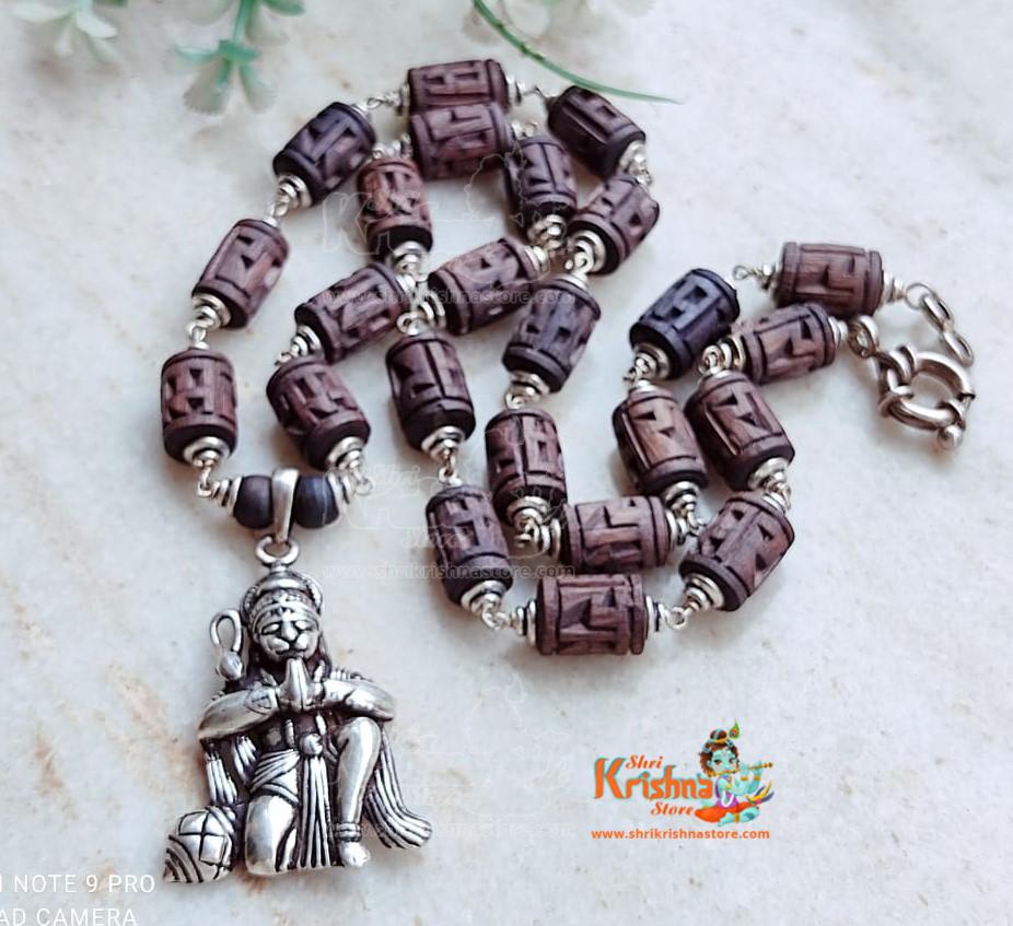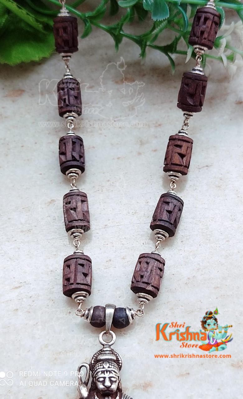 Tulsi Ram Carved Beads Silver Kanthi Mala With Silver Hanuman Ji Locket Pendent